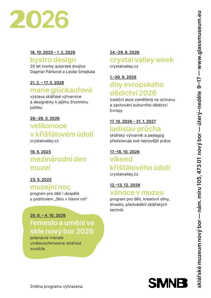 Vánoční show na huti Předvánoční výprodej u Novotný Glass Vánoční ozdoby z regionu v nejstarší garáži v českých zemích Vánoční podvečerní prohlídky Křišťálového chrámu Vánoční tvoření 2025 v Muzeu skla a bižuterie v Jablonci nad Nisou Vánoční tvořivá dílnička ve Sklárně Novosad & syn Autorská výstava: Martina Josífek Zelinková Vánoce umíme skvěle!  Ples města Jablonec nad Nisou 2026 – Třpytivých 160 Ve světle příběhů - Výstava děl Martiny Josífek Zelinkové Made in Jablonec 2026 Křišťálové nebe Pololetní prázdniny v muzeu Bižuterní kurz pro dospělé GEN 105 - křehkost tvaru, síla myšlenky Antonín Drobník - SKLO A ŽIVOT Jarní prázdniny v muzeu Velikonoce v Křišťálovém údolí 2026 JAN EXNAR – AD ASTRA Marie Glückaufová Lustrfest 2026 YGS 2026 - Dětské sklářské sympozium Pivní slavnosti ve Sklárně a minipivovaru Novosad & syn Harrachov Řemeslo a umění ve skle Nový Bor 2026 Vánoce v muzeu Ladislav Průcha 20 LET BYSTRO DESIGN reGenerace7 - výstava současného autorského šperku VYRAŽENO DO KOVU. Jablonecká bižuterie – Medaile – Plakety – Odznaky Salon XII. CRYSTAL VALLEY WEEK 2026 Skleněné městečko - 20. ročník festivalu sklářského řemesla