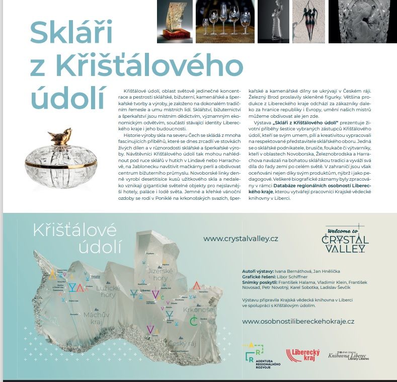 V současné době se před libereckou knihovnou chystá panelová výstava „Skláři z Křišťálového údolí“, která přiblíží životní i umělecké příběhy šestice vybraných zástupců Křišťálového údolí, kteří se svým umem, pílí a kreativitou vypracovali na respektované představitele sklářského oboru. Jedná se o sklářské výrobce, brusiče, foukače či výtvarníky, kteří v oblastech Novoborska, Železnobrodska a Harrachova navázali na bohatou sklářskou tradici a vyváží svá díla do řady zemí po celém světě. V zahraničí jsou však oceňováni nejen díky svým produktům, nýbrž i jako pedagogové. Veškeré biografické záznamy byly zpracovány v rámci Databáze regionálních osobností Libereckého kraje, kterou vytvářejí pracovníci Krajské vědecké knihovny v Liberci.