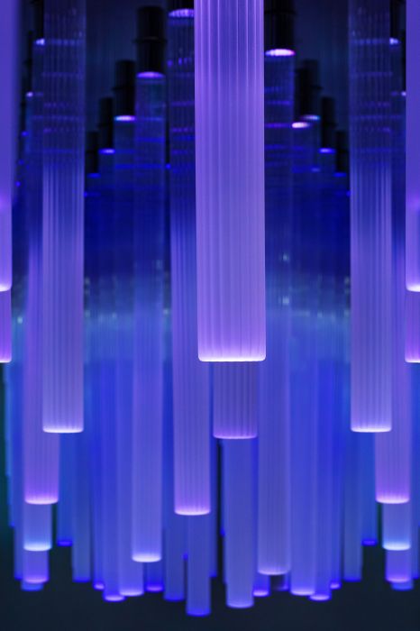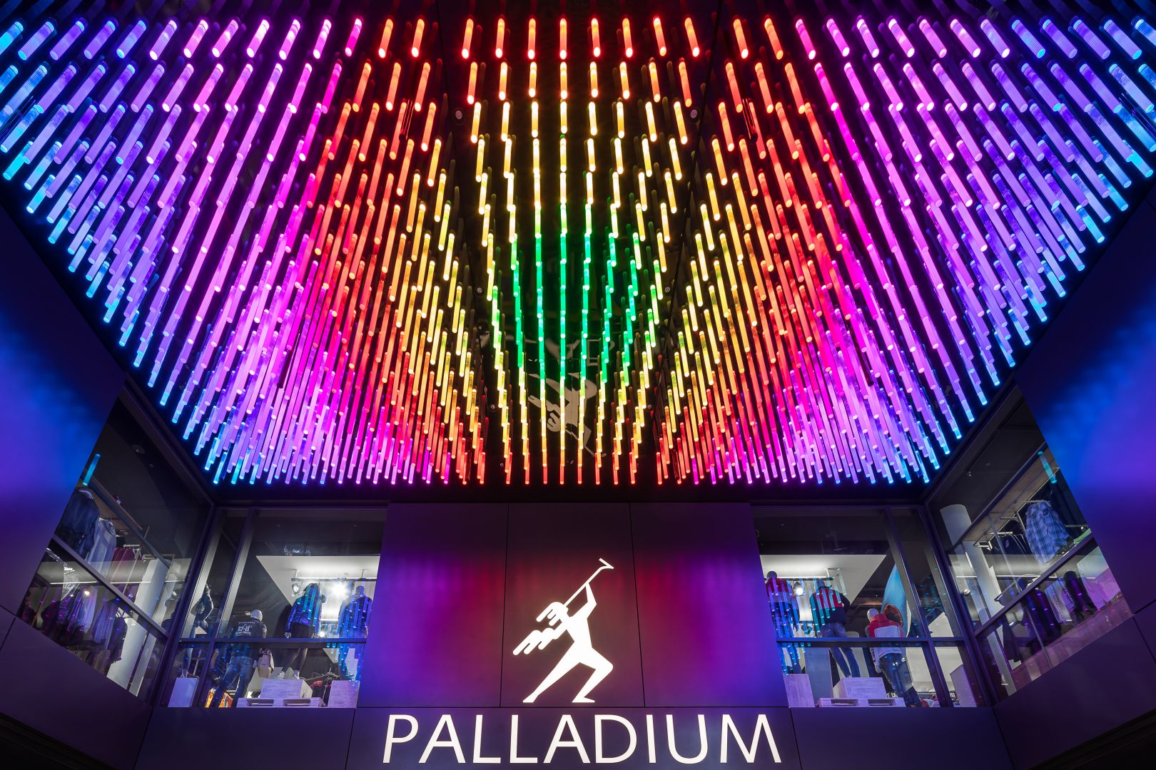 Svítidla ze severu Čech, od společnosti Preciosa Lighting, se nacházejí ve vstupní hale ve směru z náměstí Republiky a také v příchodu od stanice metra. Instalace jsou inspirovány motivem vln a díky svému designovému i technickému řešení působí neuvěřitelně živě a dynamicky. Skládají se ze stovek skleněných trubic, v nichž se nachází světelný zdroj. Každé ze svítidel umožňuje měnit světelné scény i intenzitu svícení. Dávají tak možnost PALLADIU reagovat na aktuální události. „Světelné instalace dokážou poskytnout podmanivou světelnou show v každém z těchto důležitých interiérů nákupního centra,“ popisuje architekt Juan F. Rivera ze studia Licht 01, které nový koncept osvětlení PALLADIA navrhovalo. Speciální řídicí systém pro technickou obsluhu svítidel je rovněž dílem šenovských specialistů.