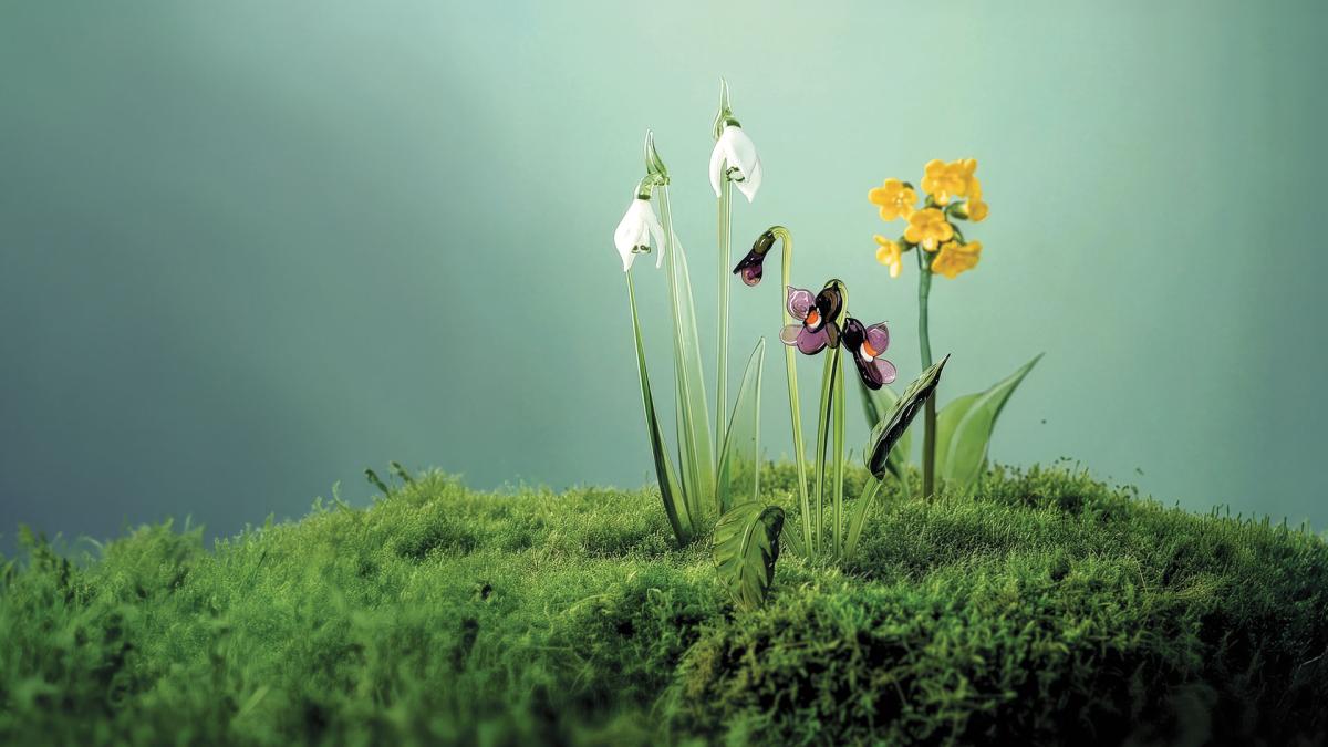 Křehké květy rozkvetly v ohni kahanu pod rukama jablonecké sklářky Marie Horčičkové. Kytici zasadila do čirého skleněného podstavce z hutě Jiřího Pačinka.
