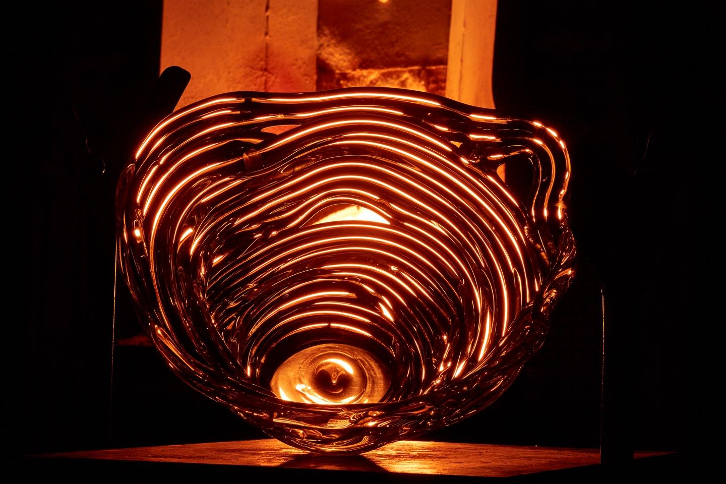 Prohlídka sbírky moderního skla z celého světa s výhledem na skláře při práci.