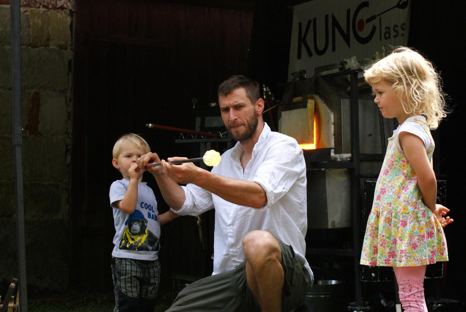 Výrobu skla u sklářských pecí můžou návštěvníci sledovat zblízka. Děti mohou vyzkoušet práci se žhavou sklovinou a sklářskou píšťalou.