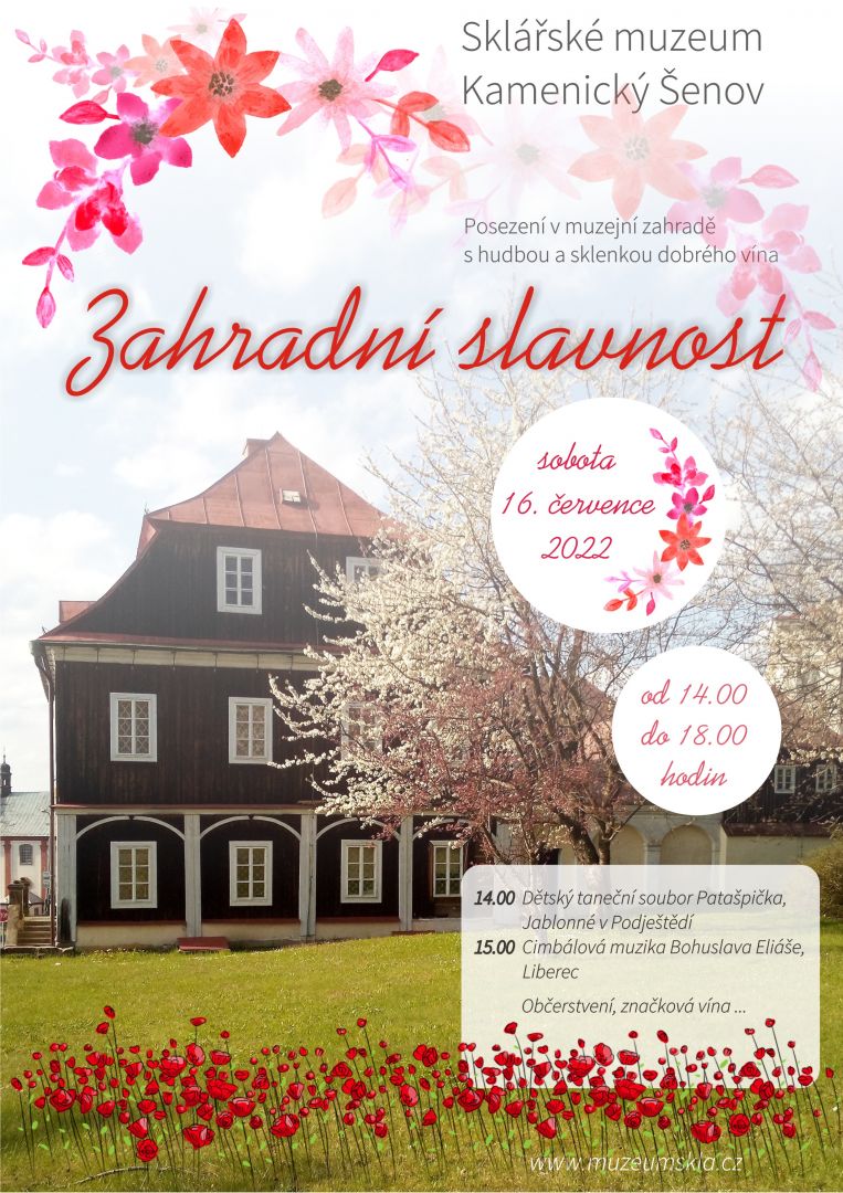 Am 16.07.2022 findet im Glasmuseum in Kamenický Šenov ein Gartenfest mit der Liberecer Hackbrettmusik von Bohuslav Eliáš statt. Das Programm beginnt um 14.00 Uhr mit einem Auftritt der Kindertanzgruppe Patašpička aus Jablonné v Podještědí. Für Kinder wird auch ein Kunstworkshop vorbereitet.
