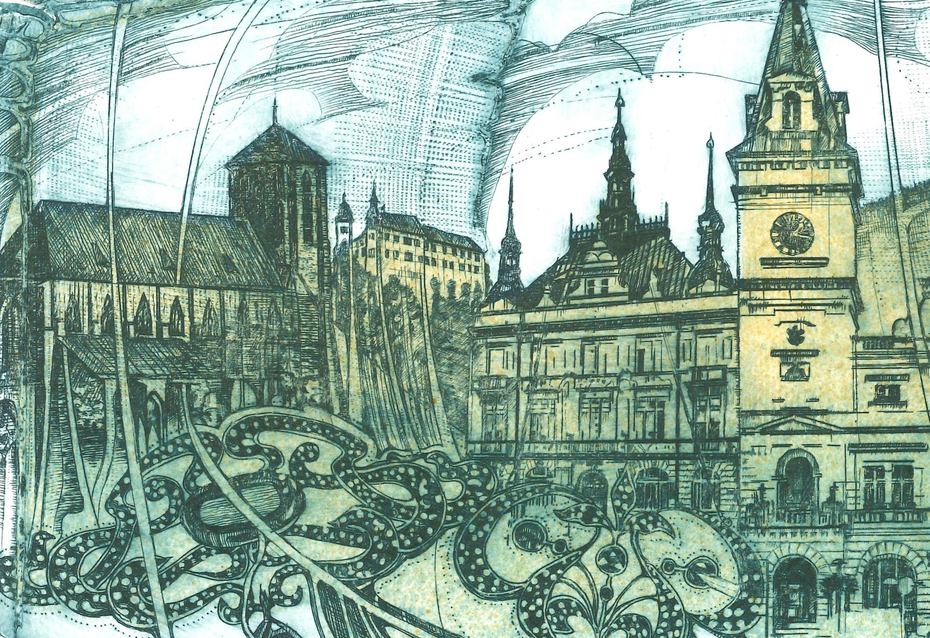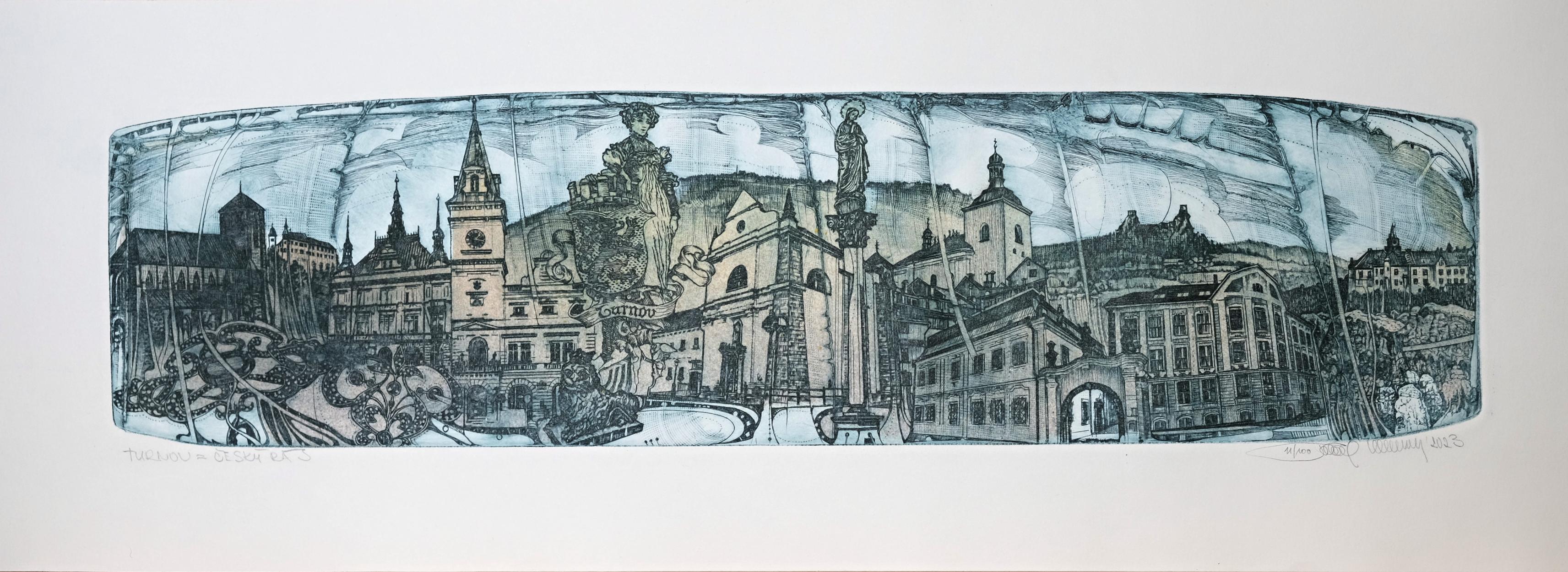 Pavel Hlavatý is one of the leading Czech graphic artists, who is highly regarded in the field of graphic design even abroad (he has collected more than 60 international awards for his graphic work) and, even at his blessed age, he likes to return to his native Bohemian Paradise. The elongated graphic work, measuring 50 x 14 cm, is made using the drypoint technique combined with etching and takes the form of a composition created from the main architectural and art-historical monuments of the town (town churches, town hall, savings bank, Marian column) and surrounding natural and artistic attractions (Kozákov, Trosky, Hruboskalské skalní město, etc.). Objects and places associated with the local tradition of goldsmithing and gem cutting also occupy an important place in the composition, including a jewelry school and examples of Art Nouveau jewelry with Czech garnets.